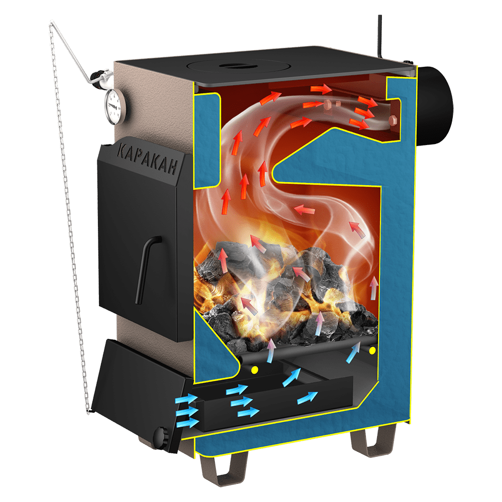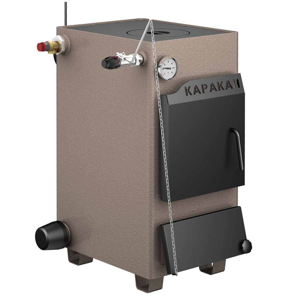 Достоинство этого котла - малые габариты в плане. По этой причине котел КАРАКАН-10 активно используют для отопления вахтовых домиков - на площади в треть квадратного метра получаем и отопительную установку, и варочную печь. Зачастую потребители предпочитают пользоваться для отопления блоком ТЭНов, а возможности твердотопливного котла приберечь для аварийного отключения электроэнергии.